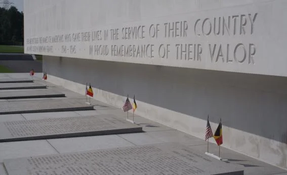 “This cemetery is unique among all ABMC cemeteries as it served as the central identification point for the entire European Theater of Operations from the last days of the war until 1960. The Ardennes American Cemetery is the final resting place for 5,317 Americans, with 65 percent of those being fallen airmen of the U.S. Army Air Forces. Their headstones are aligned in straight rows that compose the form of a Greek cross. Along the outside of the memorial, inscribed on granite slabs, are the names of 463 of the missing, whose remains were never recovered. The façade on the far (north) end that overlooks the burial area bears the insignia, in mosaic, of the major U.S. units that operated in northwest Europe in World War II.”